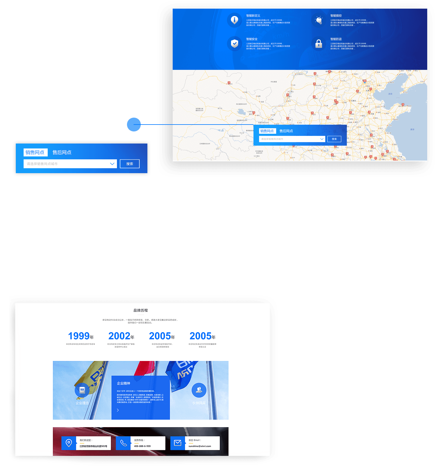新日电动车官网调取百度地图实时数据,通过标签定位的方式,实现销售网点、售后网点的查询,极大的方便了用户,提升了服务质量和销售渠道。大事记